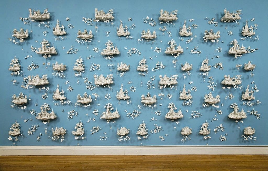 Katleman, like Warhol and Picasso, works with wallpaper; her Folly installation (2010), for example, consisted of florid porcelain sculptures mounted onto a pastel blue wall, creating a kind of three-dimensionally patterned paper. Unlike her male predecessors, however, Katleman also uses this medium to explore—and, ultimately, undermine—the myths of domesticity. “There’s been a tradition of artists inspired by wallpaper,” she has said. “It’s so polite….You think, English country houses. You feel comfortable. You are used to feeling like it’s in the background, and that it’s safe. So, as an artist, you can use that to mess with people’s heads. Wallpaper puts people’s defenses down, and you can exploit that a little bit.”